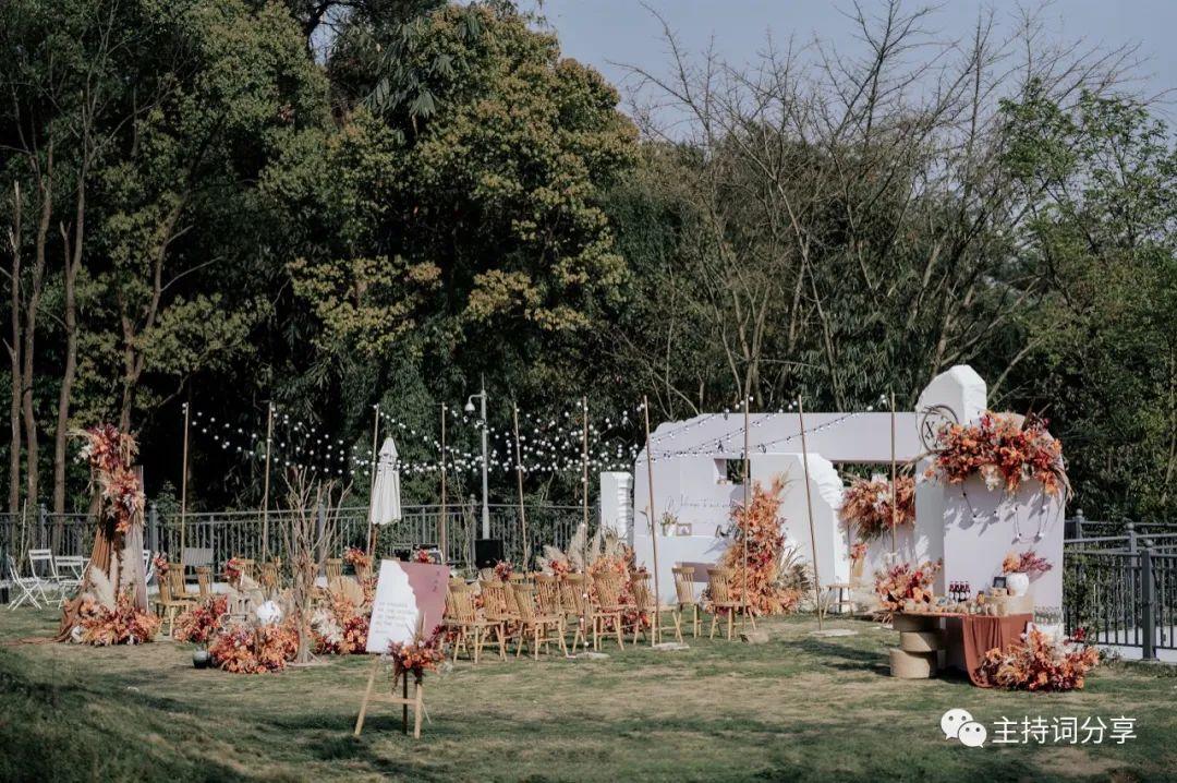 现在婚礼正式开始啦 那在这里呢首先要特别的感谢大家能够在今天这样一个美好的中午时光 头顶的阳光刚好 温暖不刺眼 我们以爱之名来到这样一个安静的地方 和在座的各位一样 当我第一次来到这片区域的时候 我发现大家都在拿着手机 拍摄来记录下一些特别幸福而又温暖的场景