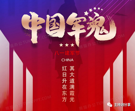 男主持:八月是灿烂的,因为有盛夏的阳光,八月是辉煌的,因为有军中奏响的乐章,95年的今天南昌起义的第一声枪声,宣告了中国人民解放军的诞生,人民军队从弱到强、浴血战、屡摧强敌,历经95载,如今己成为震撼世界的赫赫劲旅。在此,我们向中国人民解放军官兵、武警官兵,复员、转业军人致以崇高的敬意!祝你们节日快乐!