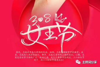 男:在这春回大地,万象更新的季节里,我们迎来了全世界劳动妇女光荣的节日——三八国际劳动妇女节。