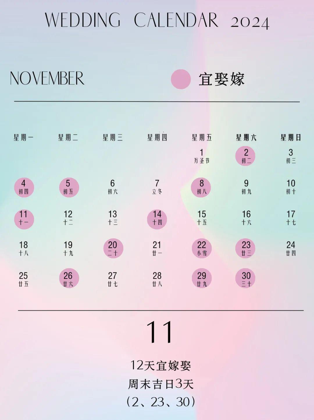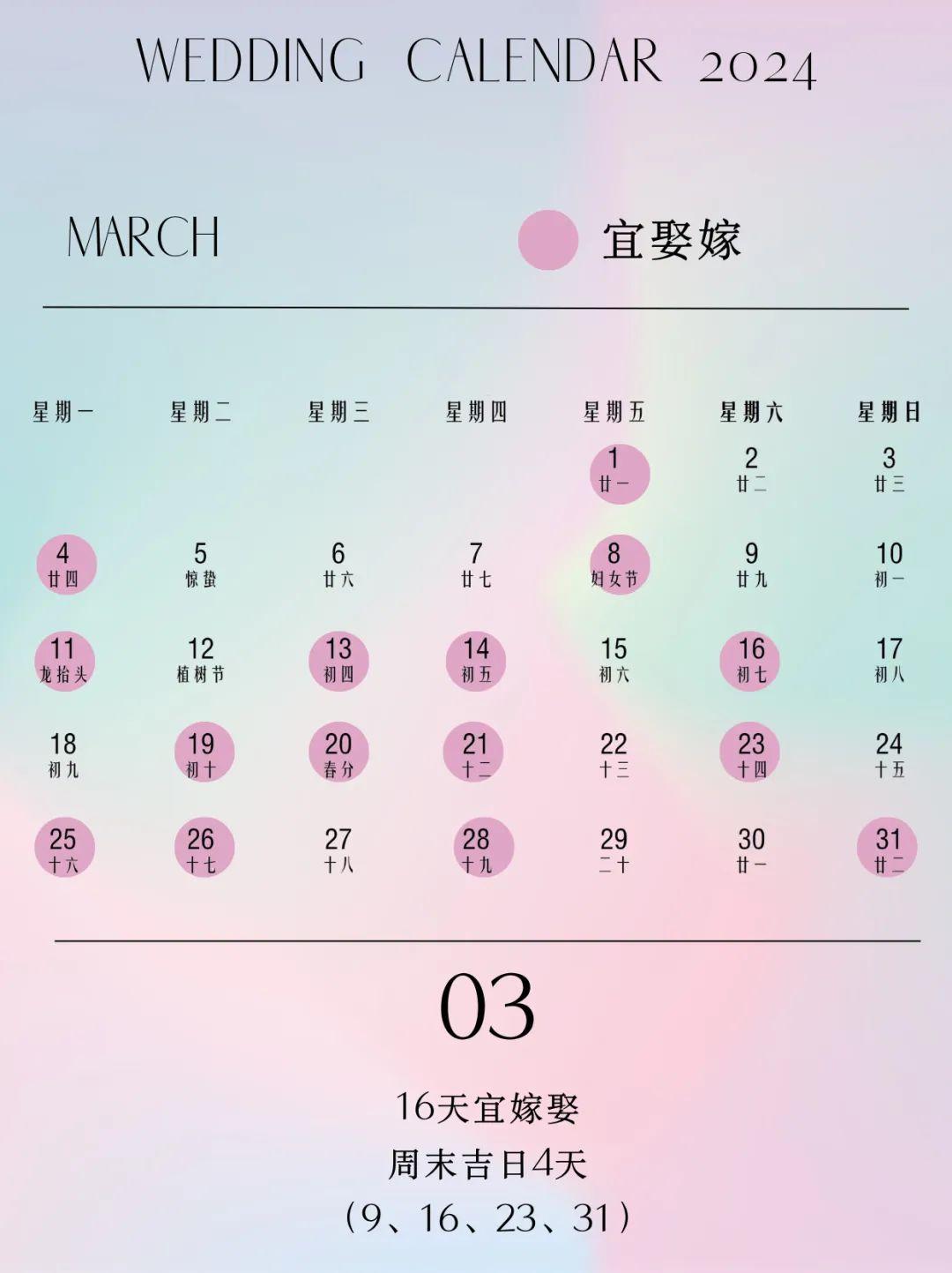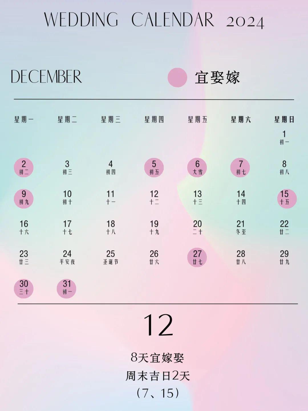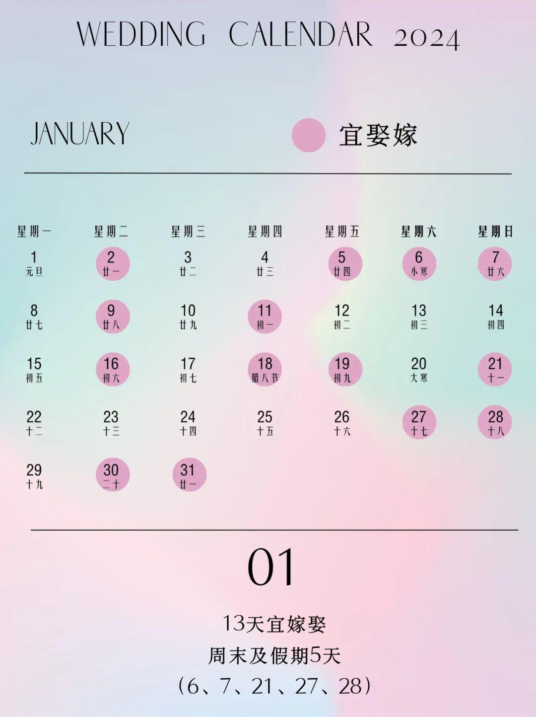 2023年即将过去,赶紧来看看《2024年的结婚黄道吉日》,现在开始关注,可以让你的抢到最佳的婚礼档期~
