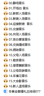 说明:此资料台词和音乐是一个整体,每个环节都是融合在一起的,共17首音乐,主持词3000多字,适合冬季的通用婚礼台词音乐,最新出品,拒绝烂大街,拒绝老掉牙...售价:29.9元...