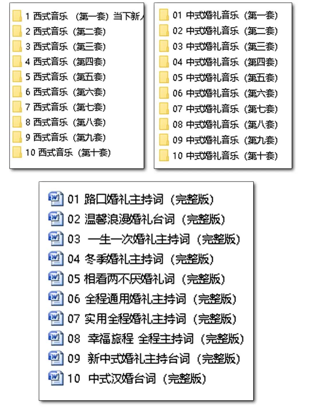 2021 二期 婚礼音乐台词,共10套整场西式婚礼音乐+10套整场中式婚礼音乐+10套完整婚礼主持词,其中包括两套中式主持词。共242首音乐 1.16G。