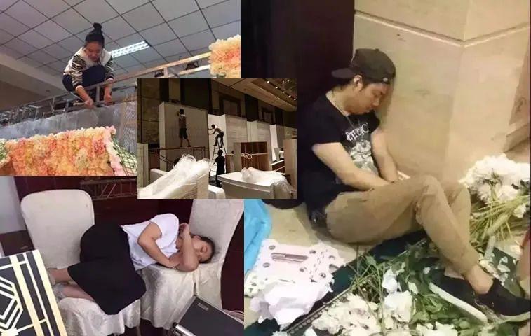 很多新人不了解婚礼这一行业,以为付了钱就应该有美美的婚礼现场,完美的婚礼仪式。是,这些都是你应该有的,但这一切都是婚礼人多少个不眠之夜辛苦完成的。每天只睡4个小时,甚至几天连轴转,睡觉成了最大的奢侈,有时只能在椅子上甚至大街上找个地方眯一会。每天24小时要保证手机畅通,别人已经开始吃早餐,我们还在婚礼现场搭建。无论是凌晨四五点钟,还是子夜寂静的街都能看到婚礼人奔波的身影。
